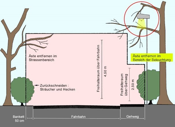 Durch das Zuwachsen von Straßenlampen oder -schildern wird die Verkehrssicherheit beeinträchtigt und die Orientierung von ortsfremden Personen erschwert.