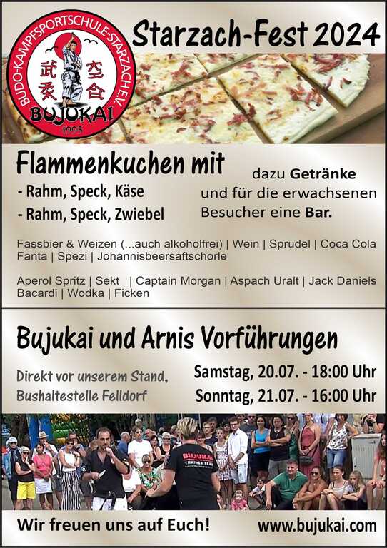 Die Budo-Kampfsportschule Starzach e.V. wird ebenfalls mit einem Stand auf dem Starzach Fest vertreten sein. Dort werden Flammkuchen, Getränke und eine Bar angeboten. Zusätzlich gibt es zwei spannende Vorführungen, bei denen die Kampfsportarten Bujukai, Arnis und Kyusho-Qigong präsentiert werden. Diese Vorführungen finden am Samstag um 18:00 Uhr und am Sonntag um 16:00 Uhr statt und zeigen sowohl Kinder als auch Erwachsene in Aktion.